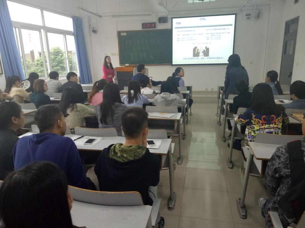 在播放宣传片之后,由华贸国际物流有限公司的副总经理对公司做了更详细的介绍,其中包括了该公司在世界范围内的物流网,各项工作和职能部门,国内各地存储仓库,空运、海运优势等。最后还就同学们的疑惑做出解答,解释了应聘实习的具体流程,给出的实习职位,相关薪酬和工作要求。