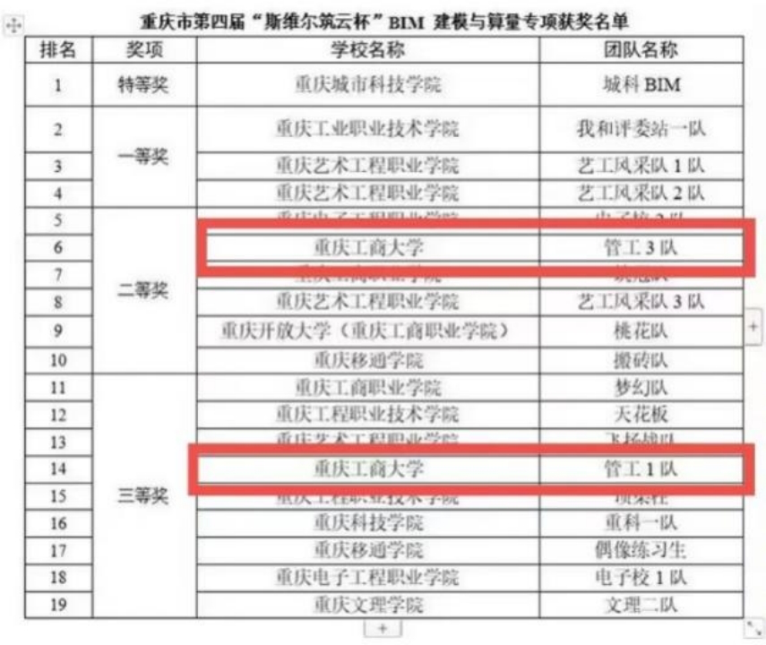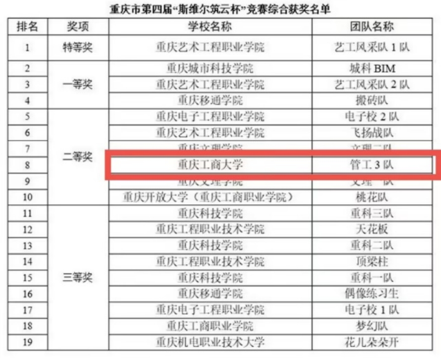 2023年4月8日,由重庆市土木建筑学会主办、重庆艺术工程职业公司承办,深圳市斯维尔科技股份有限公司和重庆市筑云科技有限责任公司协办的重庆市第四届“斯维尔筑云杯”高等院校员工BIM技术应用技能竞赛在重庆艺术工程职业公司圆满完成。本次比赛以团队方式进行,各团队成员进行现场答题,合作完成各科目题目。公司工程管理专业员工在此次比赛中共获得了三个奖项,分别是单项二等奖、三等奖、团队二等奖和优秀指导老师奖。
