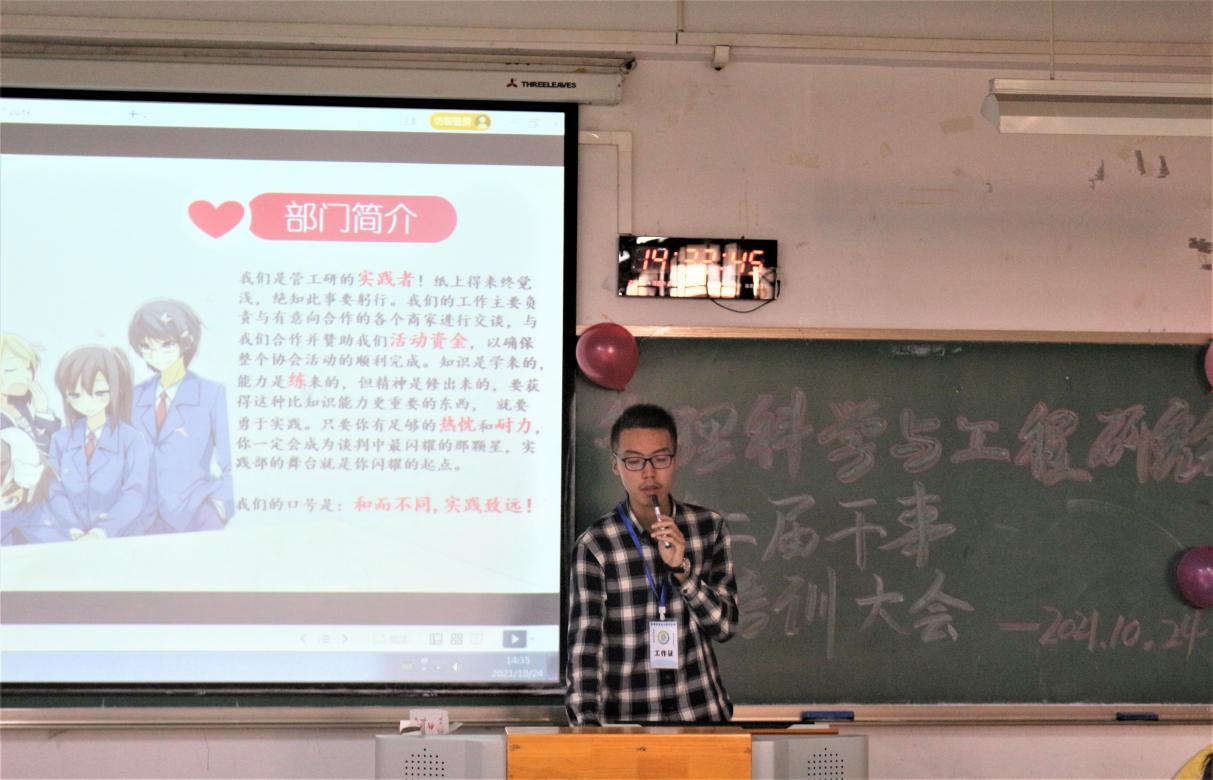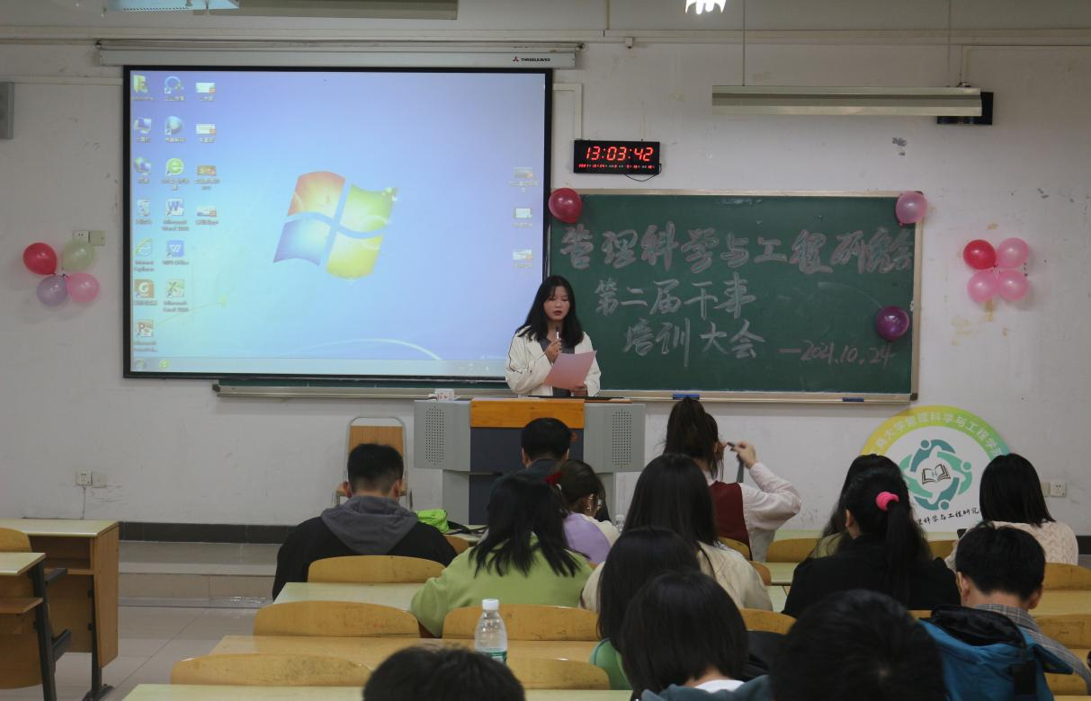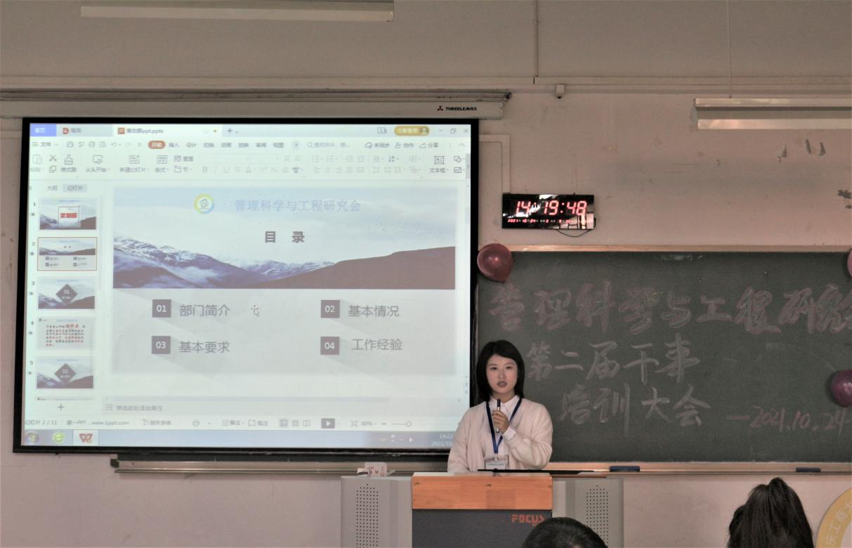 10月24日下午,第二届管理科学与工程研究会干事培训大会在太阳网集团tcy8722江北校区b106顺利开展。参与本次培训会的有管理科学与工程研究会会长团成员、各部门负责人以及全体干事成员。本次活动由公关部干事李飞飞主持。