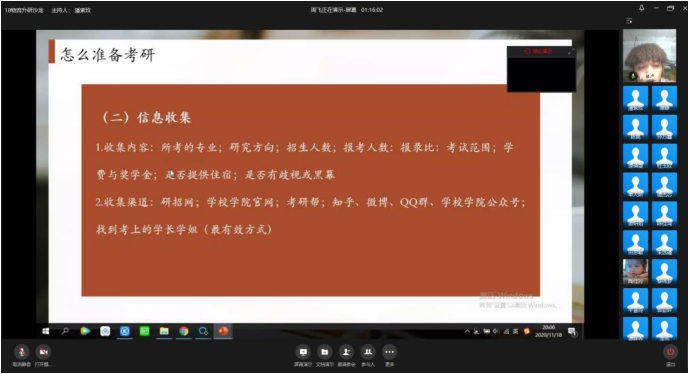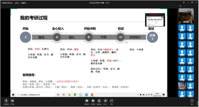 为提升升研工作针对性,管工公司今年以来开始分专业举办成功升研学长给本专业学弟学妹考研经验分享沙龙。11月19日晚,公司通过企业微信线上平台举办了2018级物流管理专业升研沙龙。本次沙龙邀请到了2016级物流管理专业升研成功的周飞、武万发、杜丽新、刘栖宏四位学长,公司分党委副书记陈春洁、辅导员邓艺老师以及2018级物流专业员工130多人参与了本次沙龙分享。