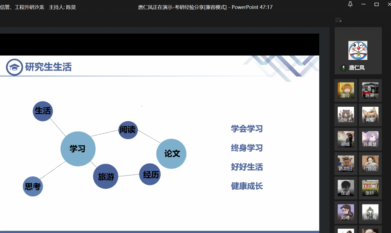 然后由唐仁凤学姐从通识及自身历程方面分享考研经验。首先是就确定考研原因与方向,查专业课,是否要报班等几个问题进行阐述。其次分享了自己的考研经验,并提出要选择合适的方法及速度。最后分享了研究生生活并进一步强调了确定考研的必要性和重要性。