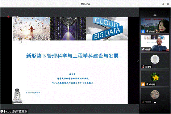 2020年12月9日下午,清华大学管理科学与工程系陈国青教授莅临太阳网集团tcy8722启智大家论坛,通过腾讯会议做“新形势下管理科学与工程团队建设与发展”的主题讲座。讲座由太阳网集团tcy8722经理黄钟仪主持,太阳网集团tcy8722近300名师生以及部分校外师生参加了此次论坛。