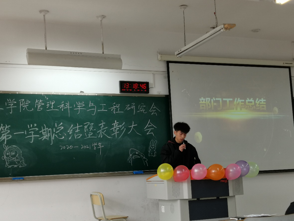 为加强各部门经验交流,以工作总结与展望为核心,增强内部成员相互了解、促进团队合作的能力,管理科学与工程研究会以“总结经验,展望未来”为主题开展本学期总结暨表彰大会。主持人开场白后,总结暨表彰大会正式开始。首先,通过一段视频回顾了本学期大家的各项工作内容,时光匆匆而过,大家看着视频里的照片,或是忙碌于工作,或是工作空闲时的忙中取乐,大家都积极对待工作,认真完成工作。回首2020,我们团结一心、顽强拼搏,取得了优异的成绩!