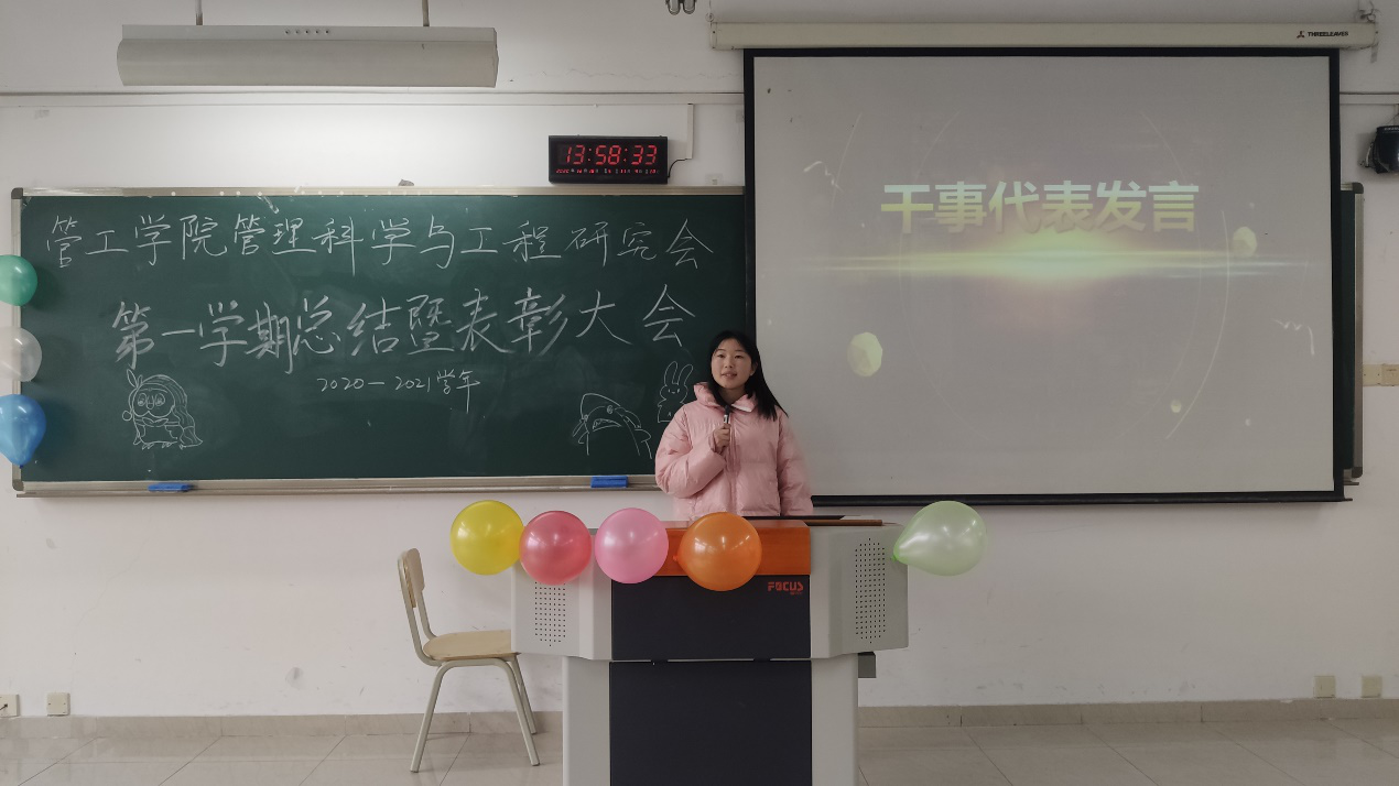 随后,会长代表曹恬恬上台发言,不仅对管理科学与工程研究会本学期的工作进行了总结,还表达了自己对管工研未来的展望,我们组织虽是第一届,但是更加需要我们的努力,希望在我们的共同努力下能将管理科学与工程研究会建设得越来越好,也希望大家都能在工作中有所收获有所提高。