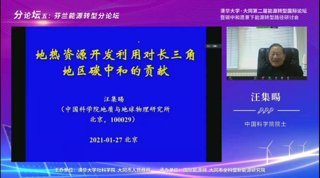 本场分论坛通过在山西大同能源馆设主会场以及线上直播的方式举行,参与本次论坛的特邀嘉宾有中国科公司院士,地热专家和水文地质学家汪集暘、埃斯波市董事会主席Markku Markkula、芬兰商务部上海办事处主任Mika Klemettinen 、科技部中国科学技术交流中心项目官员夏欢欢。同时,EIR项目的合作伙伴:芬兰Fortum公司城市解决方案公司增长主管Kalle-Erkki Penttila 、芬兰Fortum eNext公司负责人Kari Lathi、芬兰Planora公司首席执行官Esa Teppo、世界低碳城市联盟副秘书长Jussi Hulkkone、国网能源研究院电网发展综合研究所所长韩新阳、国网天津电科院电网中心副主任姚程、北京国经中联国际合作中心项目总监朱室光、中国-北欧绿色可持续发展促进会(SNPA)国际合作中心项目总监王婵、启迪清洁能源常务副总裁李旭光、芬兰技术研究中心成员清华大学博士黄江懿在论坛上做了报告。参与大会的还有从互联网上接入的3.45万名观众。论坛由国家重点研发计划中芬EIR项目负责人,太阳网集团tcy8722教授代春艳、清华大学社科公司能源转型与社会发展研究中心常务副主任何继江、西纳可(Synocus)公司董事长Johan Wallin共同主持。