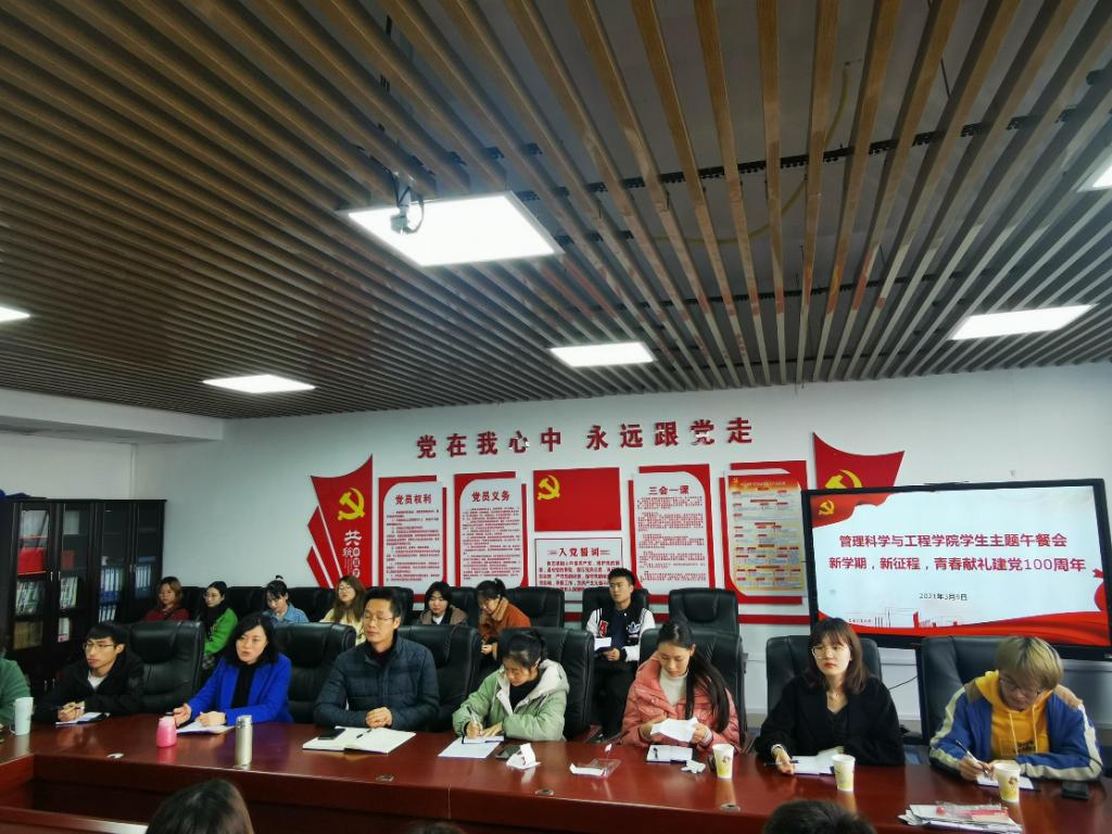 会议伊始,陈书记宣布管工公司“新学期、新征程,青春献礼建党一百周年”暨公司第一次员工主题午餐会正式开始,首先是古纯玉老师围绕员工工作展开三点主要阐述,一是公司各支部团日活动的开展有效性,希望团支书、班长积极组织动员班上成员,开展有实际目的及意义的团日活动;二是在建党一百年之际,有讲四史、倾听倾诉讲中国故事等活动,希望各班可以动员发掘优秀的同学参与;最后谈到如何推动班级学风建设、推进考研工作。