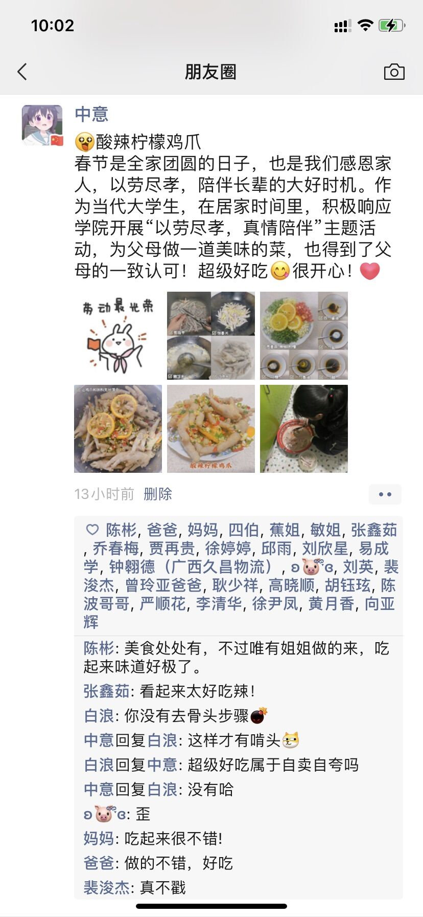 孝道自古以来是中国的传统美德。春节正值寒假期间,全家团圆时,也是我们感恩家人,以劳尽孝的好时机。公司分团委利用线上平台,围绕“尽孝”主题,创新开展劳动教育活动。在本次主题活动中,公司分团委为同学们提供了劳动清单,共列出了17余项,例如,“员工可以为父母做一顿可口的饭菜;可以亲手制作春节礼物送给父母;可以帮父母一起进行春节大扫除等等”,让大家可以充分利用居家时间,挑选一个或多个劳动任务从小事做起,用劳动生活记录点滴,树立正确的劳动观。