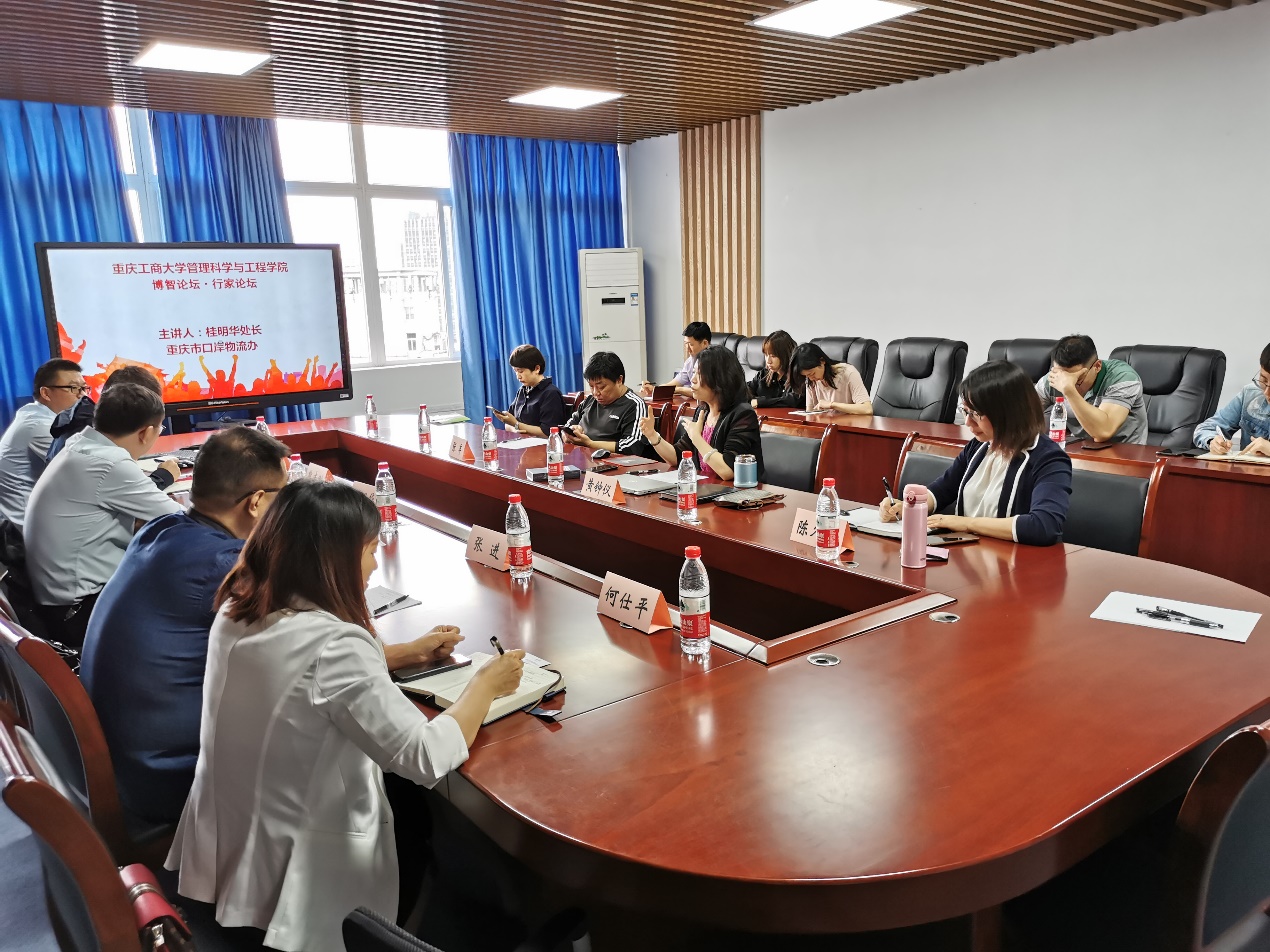 专题讲座中桂明华处长为全院师生详细介绍了重庆市国际物流通道物流、开放高地及多式联运等方面的发展现状,以及重庆市物流中长期发展规划中关于对国际物流通道与多式联运发展战略定位、规划布局和主要任务等。最后,桂处还与重庆交运物流有限公司总经理熊志刚、重庆昶阅供应链管理集团有限公司张进以及太阳网集团tcy8722陈久梅副经理和张军、周继祥、龚英、邱晗光、常建鹏、曹策俊等老师以及部分物流管理专业硕士研究生进行了积极的交流和讨论。