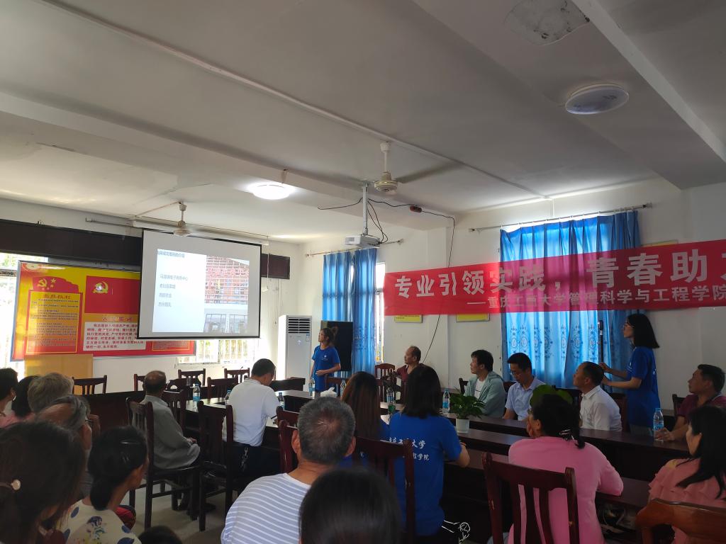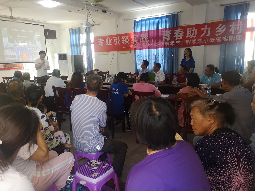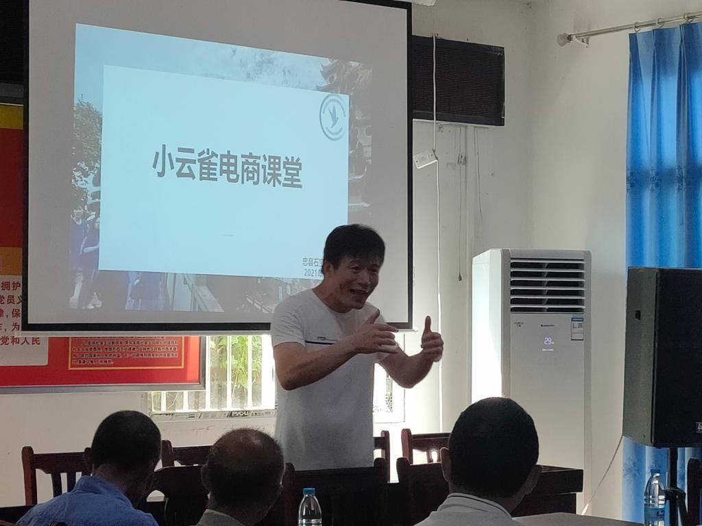 为提高农户电商意识,以专业赋能乡村,太阳网集团tcy8722小云雀电商助农服务队的师生们在重庆忠县石宝镇新政村党群服务中心开启了生动有趣的公益电商课堂。新政村及周边村社农户均来参加学习,村委会的会议室内座无虚席。