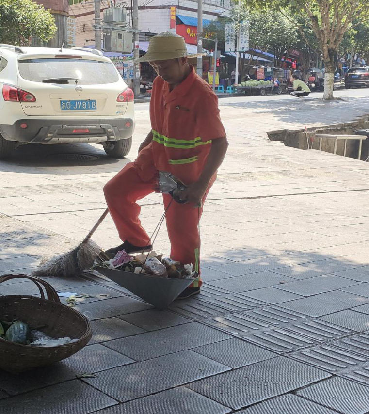为了实现资源利用效率,提高垃圾的资源价值和经济价值,力争物尽其用,国家号召社会群体积极开展垃圾分类。8月2日早上清晨,邬晶莹同学就来到环卫工人工作地,了解环卫工人的工作。6点环卫工人已经到达自身岗位开始一天的工作,早上清扫的垃圾基本都是街上零零散散的落叶,环卫工人需要一边注意来往的车辆,一边将落叶清扫成一堆后装到滚轮的垃圾箱里面。