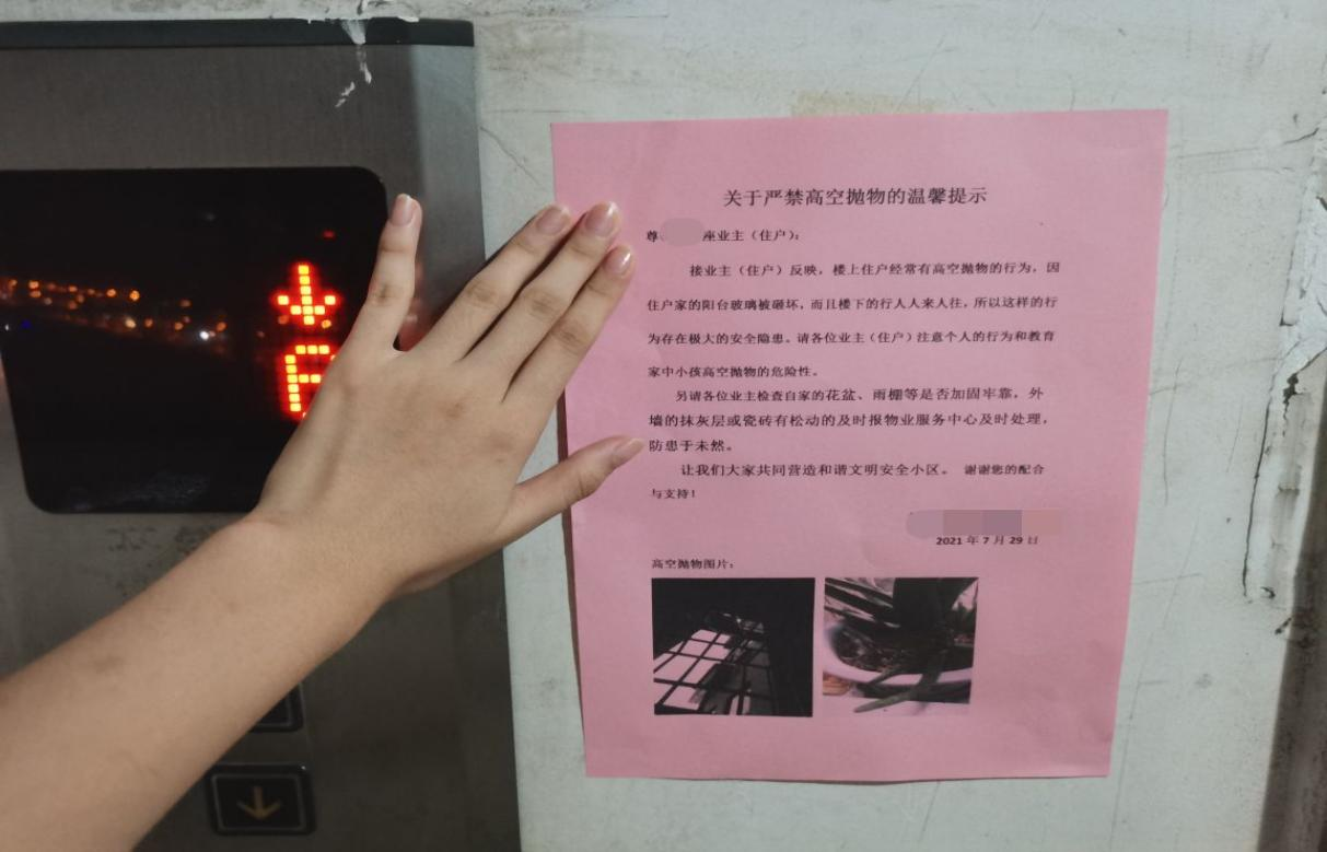 进行排查之后,张雨涵及同伴们前往落实近期居民反映的高空抛物问题,发现确实存在这样的行为。为进一步增强社区居民的安全感,张雨涵跟随工作人在每层电梯口处、主干道等张贴温馨提示,全方位地为社区居民宣传安全知识。在粘贴过程中,看到路过的居民,张雨涵也会提醒大家及时检查家里的花盆、雨棚等是都加固牢靠,外层的墙皮和瓷砖是否有脱落。虽然路过的居民对他们的提醒,态度都很敷衍,甚至快步离开,但是张雨涵希望她的举动能够引起大家的重视,社区的安全靠的不仅仅是个人,也需要大家的配合和共同努力。