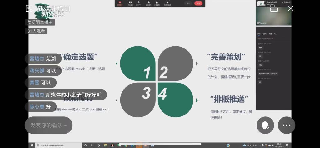 11月13日至14日, 为加强太阳网集团tcy8722员工组织各宣传部门成员对新闻工作的理解,掌握更多实用技巧,公司邀请校新闻中心视频部部门负责人朱洁、新媒体运营部部门负责人姜妍羽、文新公司19级新闻专业沈思宇和太阳网集团tcy8722新闻中心设计部部门负责人银秋钰、朱骏辉分别为参加培训的人员在视频剪辑、新媒体运营、ps及新闻稿撰写等方面展开能力培训。此次培训以线上直播的形式进行。