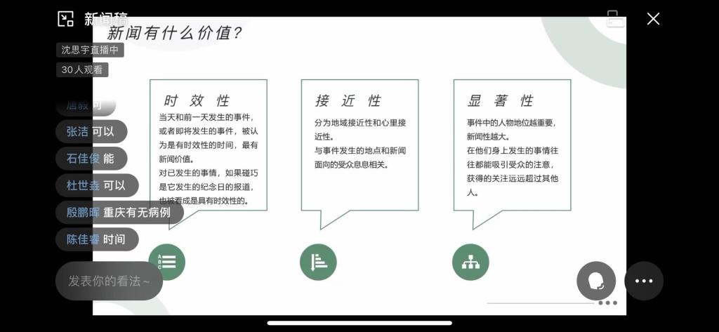 与此同时,来自文新公司19级新闻专业的沈思宇同学为大家进行了新闻稿撰写工作的相关培训。她以实时疫情为着力点,引用了陆定一的说辞“新闻就是最近发生的事实报道”,将新闻的概念呈现在大家眼前。她指出,新闻就是“新”、“事实”、“报道”,并强调新闻应具有时效性、接近性、显著性、影响性以及人情味。紧接着沈思宇同学以新闻稿框架的书写格式为中心,分别从“标题”、“导语”、“主体”、“补充”、“结尾”五个部分进行了详细的讲述并结合写稿的思路和文章结构给出了许多专业性的建议。