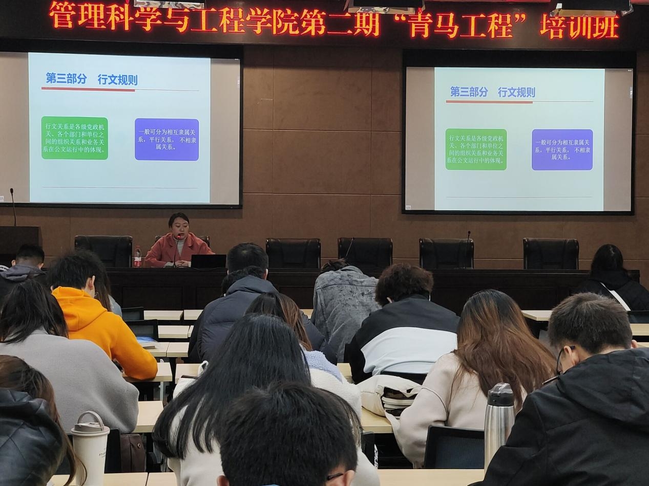 培训会上,温涵老师幽默风趣的讲解方式让大家很快进入了状态。温老师首先从公文特点和作用、公文种类、行文规则、公文起草四个方面展开此次培训会,并为大家详细讲解了公文写作的具体方法:1.真实准确无假话、2.严谨庄重无虚话、3.简明扼要无废话、4.平时易懂无大话、5.鲜明生动无套话。随后,老师就自己多年的工作经验与大家分享工作心得,让同学们能够更加通俗易懂的理解公文写作的重要性和提高公文写作的必要性。培训过程中,同学们在现场认真聆听,认真将要点记录下来。最后,伴随着阵阵掌声,此次培训会圆满结束。