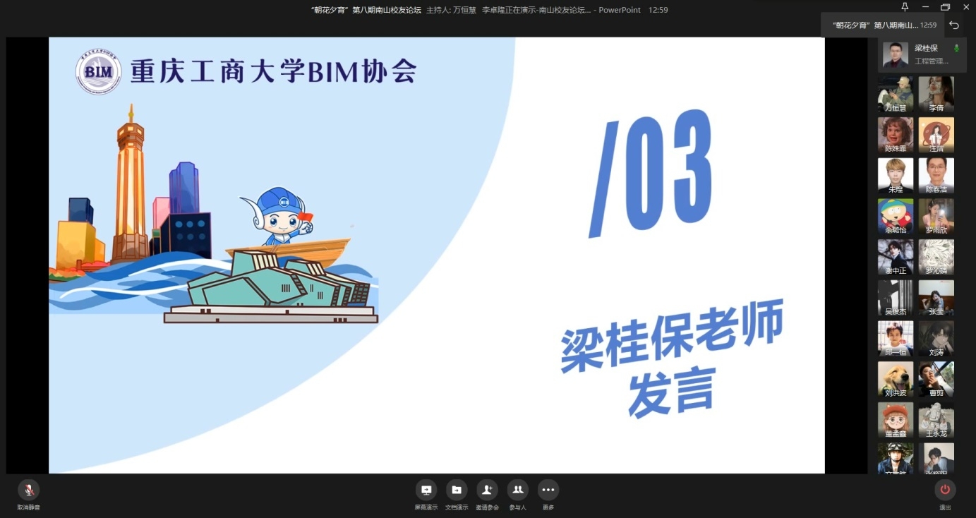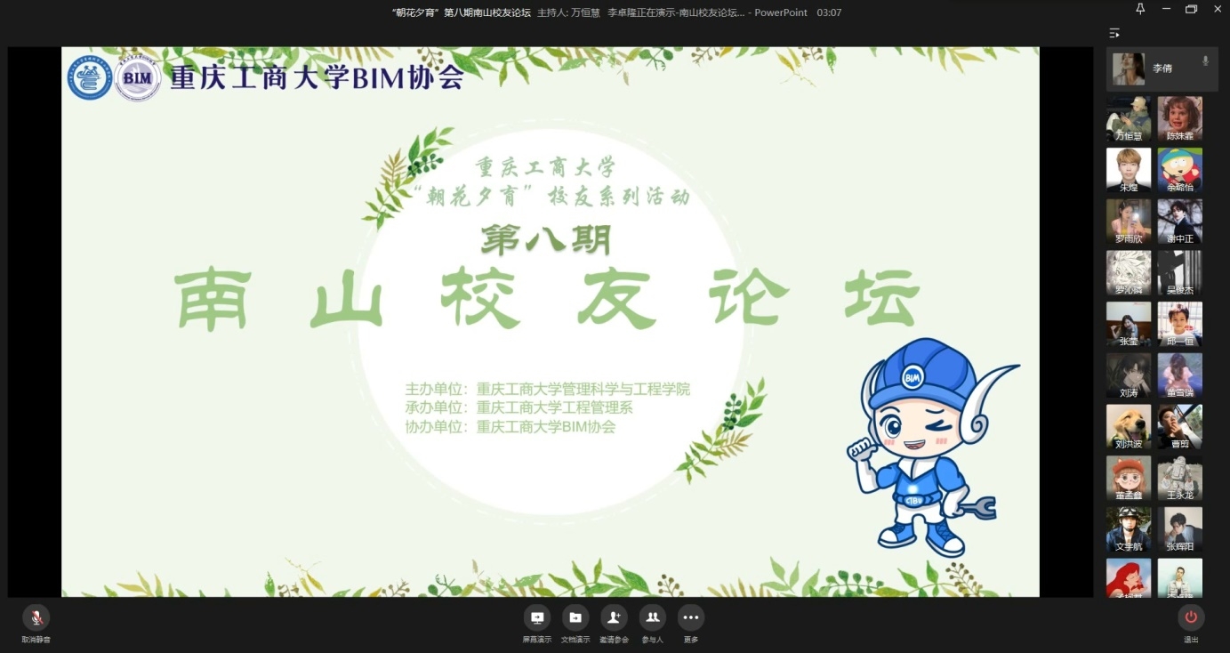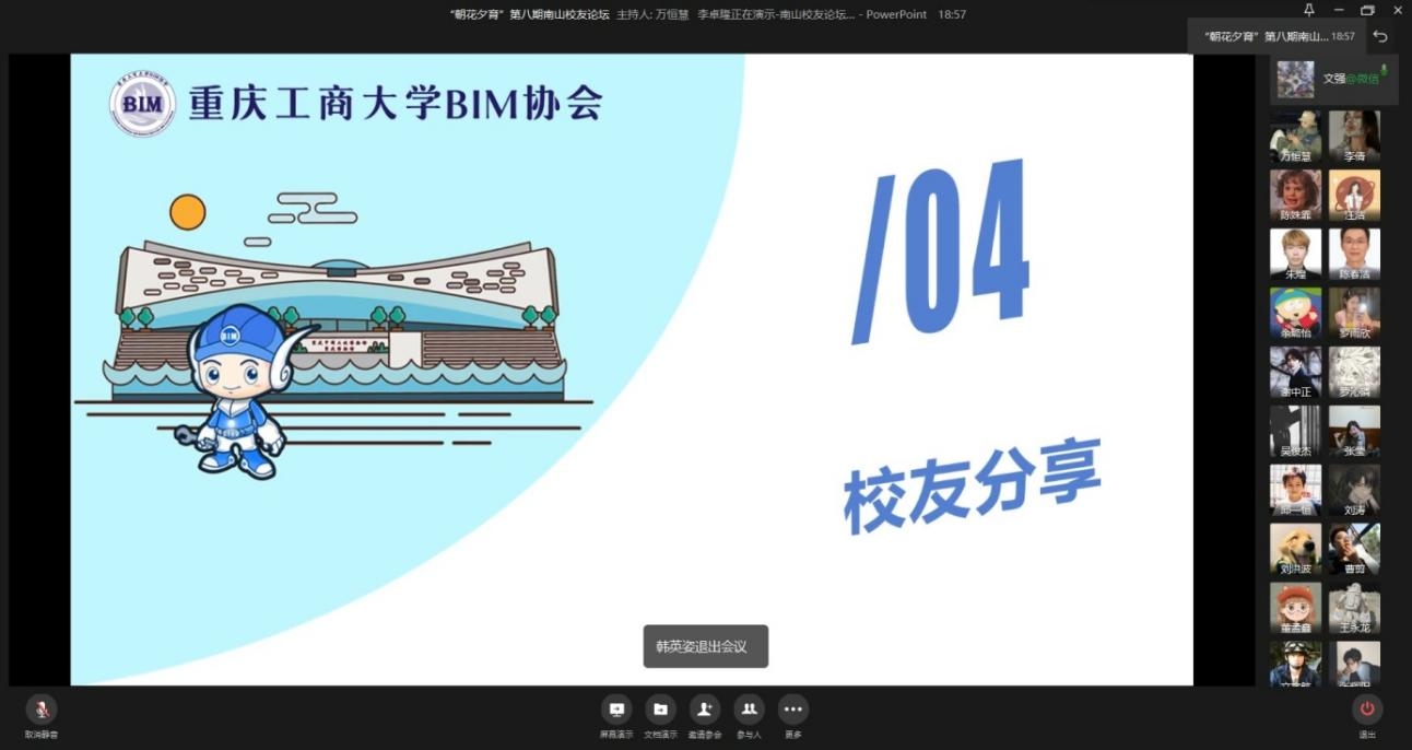 12月4日晚20:00,由太阳网集团tcy8722主办,工程管理系承办,BIM协会协办的第八期南山员工论坛以企业微信会议的方式圆满完成。本次活动以朋辈交流楷模故事的方式在公司老员工中弘扬榜样力量,通过分析求职方向以及未来的行业形势改变,让老员工们对以后的就业形势加以了解。