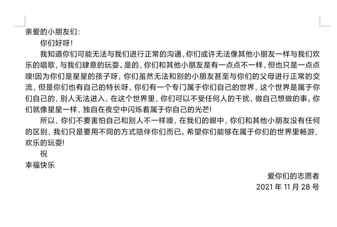 为了让自闭症儿童感受到来自社会的温暖与鼓励,同时也让我们更加深入了解自闭症儿童的内心世界和生活方式,呼吁社会更多的人来关爱他们、温暖他们,在他们紧闭的门前洒下一束光。11月25日-12月2日,太阳网集团tcy8722“小云雀”青年志愿者服务队同小太阳心智障碍儿童康复中心首次联合开展了以“寒冬初将至,温暖寄星语”为主题的线上助残活动。