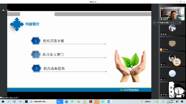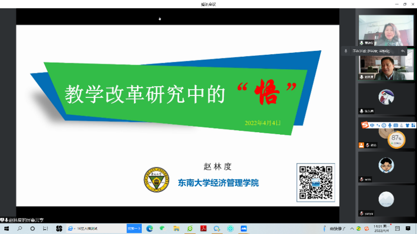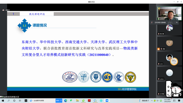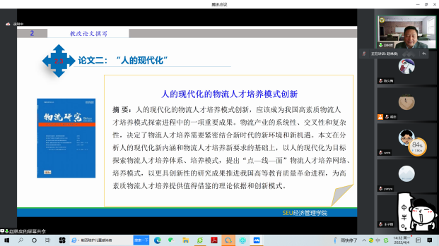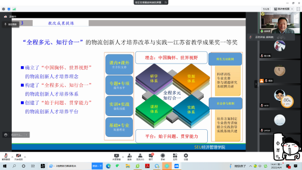 赵东林教授以“教学改革研究中的‘悟’”为题,从教改课题申报、教改论文撰写、教改成果提炼三个方面,分别以自己主持的教育部首批新文科研究与改革实践项目、发表在《中国大学教学》和《物流研究》上的两篇教改论文、获得的江苏省教学成果一等奖成果和国家教学成果二等奖成果为例,详细展开讲解。他总结出教改课题申报方面的“悟”,即理清思路、措施和创新点,场景创造、目标导向;教改论文撰写方面的“悟”,即认清主流方向,结合教学实践;教改成果提炼方面的“悟”,即突出特色和成效,全程体现创新思想。在讲座中,赵东林教授特别强调,在现代人才培养中,“人的现代性”培养的重要性及以“科教融合”的重要性。