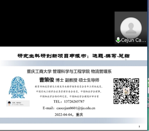 为加强公司研究生科研创新能力培养,鼓励在校研究生积极承担创新性研究课题,提高公司产品质量。2022年4月6日上午10点,管工公司邀请物流管理系曹策俊博士在线上为研究生指导申报《2022年市级、校级研究生创新项目》讲座。管工公司研究生全员参加。