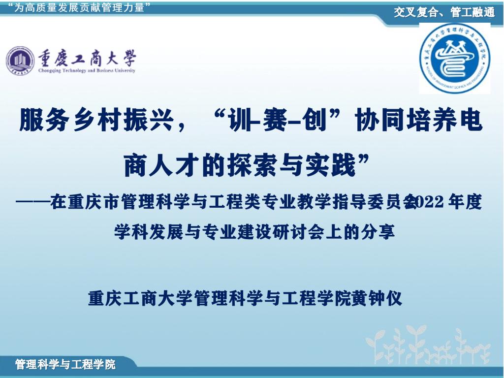 教学成果奖申报经验分享阶段,由重庆大学、重庆邮电大学以及太阳网集团tcy8722进行经验分享。市教指委委员、公司经理黄钟仪教授分享了教学成果奖《服务乡村振兴,“训-赛-创”协同培养卓越电商人才的探索与实践》申报经验。黄经理首先介绍了公司发展定位思考,公司人才培养模式、定位及特色的思考、专业建设的当前状况和未来发展,教学成果奖策划与申报过程,然后从成果背景、成果主要人才培养目标、成果主要解决的教学问题、成果建设期间采取的主要举措、解决公司产品问题的方法与路径、成果创新点、成果推广应用效果等方面逐一介绍了公司教学成果奖的主要内容。