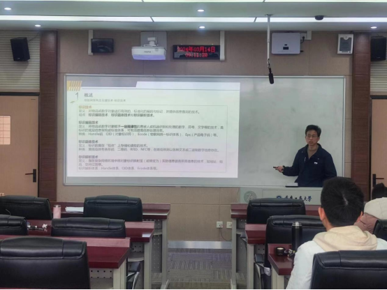 然后,姜大立教授向同学们介绍了IOT(物联网)的定义及其构成,指出,物联网是人工智能和数字化的基础,鼓励同学们关注新业态,发现新问题,研究新内容。接着,姜大立教授重点介绍了以FRID技术为代表的标识技术,并总结出RFID的特点等。