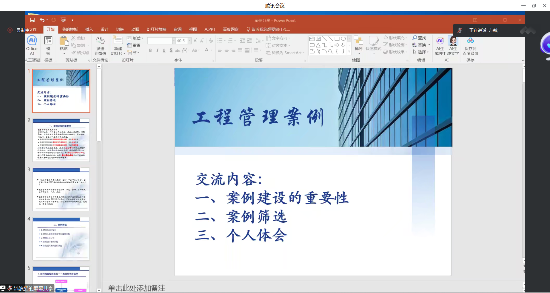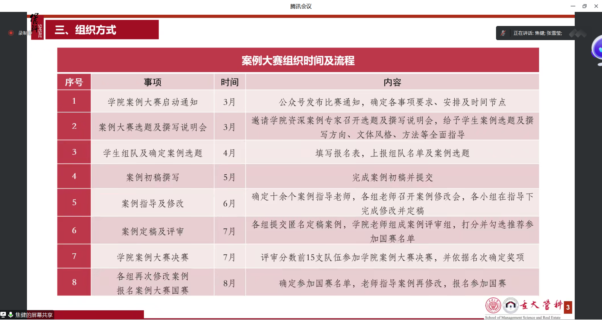 会议分为三个部分。首先由重庆大学MEM中心招生和学工主管焦健老师分享中国工程管理案例参赛组织与管理。焦老师从组织目的、历届情况和组织方式三个方面进行介绍。明确的组织目的有助于员工培养、案例培育和案例教学提升。接着焦老师展示了重庆大学历届参赛情况,并详细分享了每个自然月重庆大学推动中国工程管理案例大赛的组织安排,包括从参赛师生队伍的组建到案例的选题,再到初稿撰写以及定稿评审后上报国赛,每一个步骤都做出细致安排。