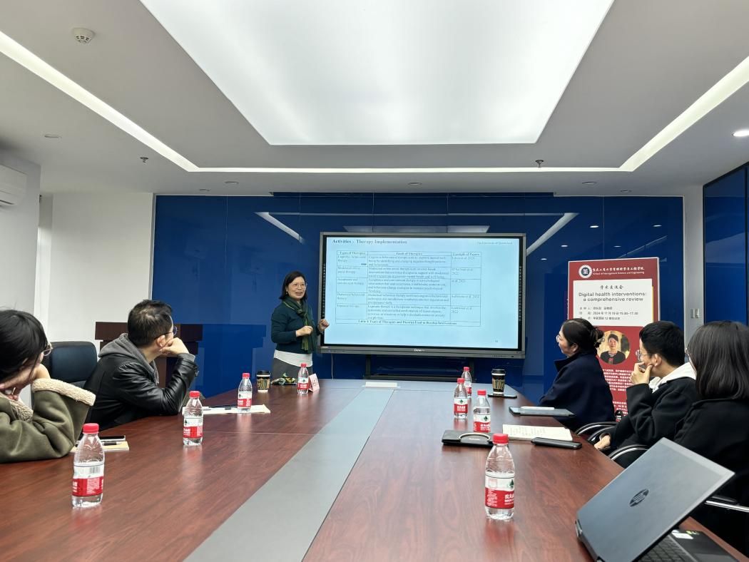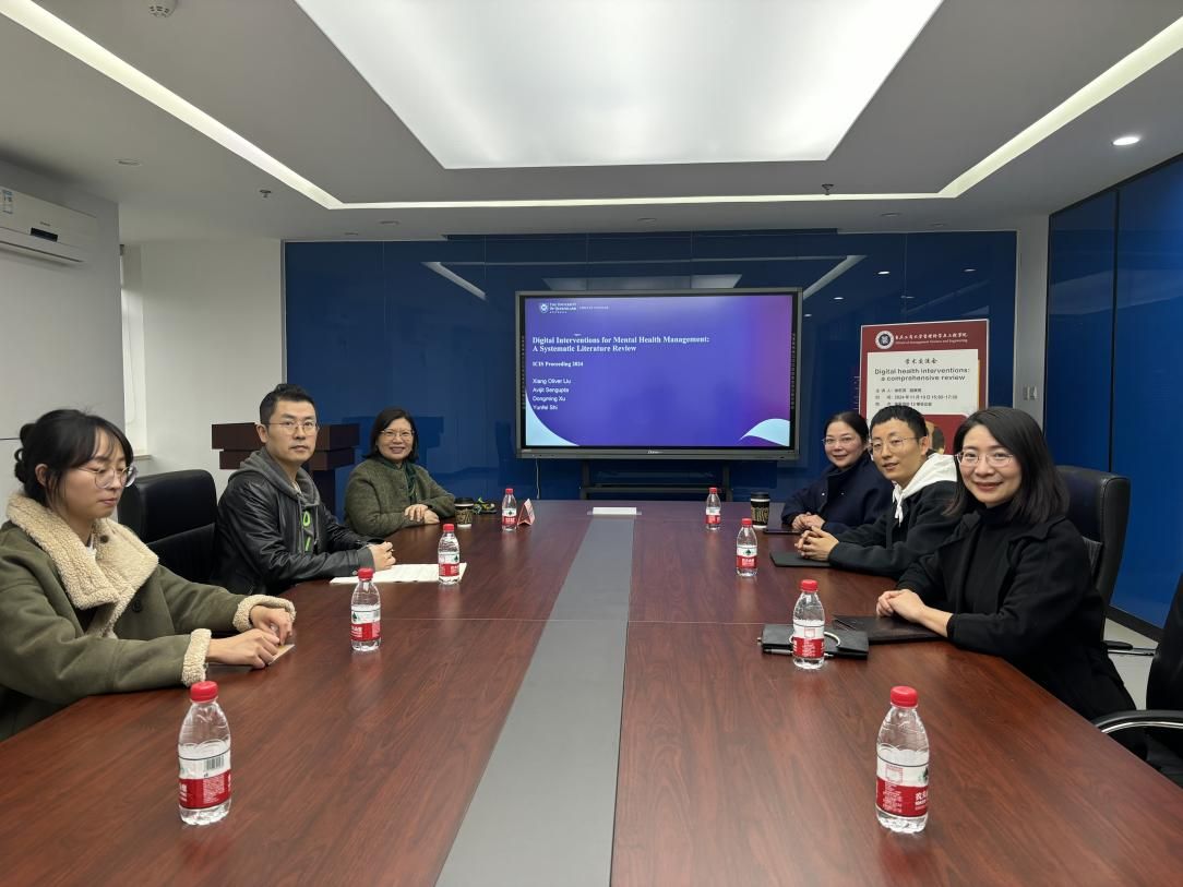 2024年11月19日下午,太阳网集团tcy8722学术交流会在学豪酒店12楼会议室成功举办。本次交流会特邀昆士兰大学商公司商业信息系统徐东溟副教授做主讲嘉宾。徐教授以《Digital health interventions:a comprehensive review》为主题,阐明了心理健康领域在数字技术的影响下正在经历变革、数字技术将如何影响医疗保健方式以及数字心理健康干预在现代社会中的作用,基于以上几点与师生展开深入交流。