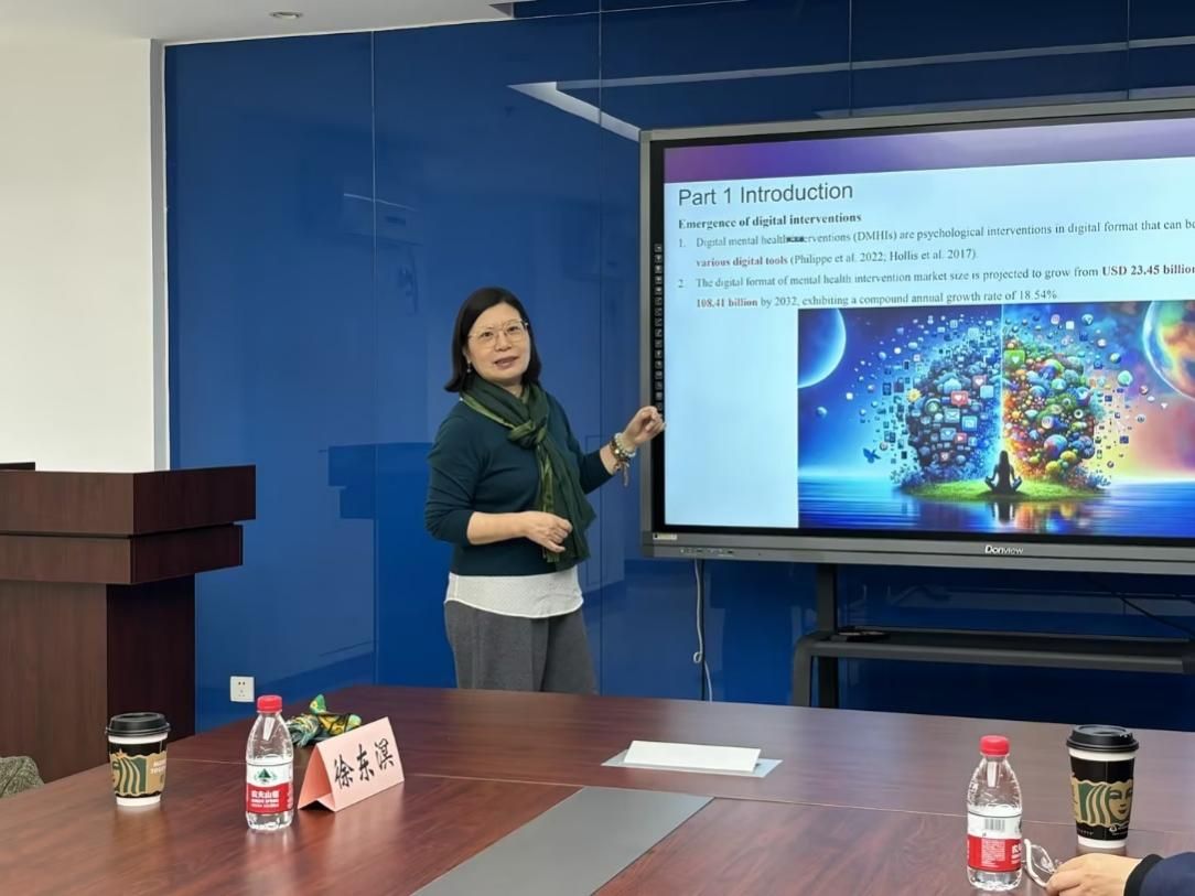 在讲座中徐教授首先分享了研究背景,徐教授指出目前全球约有八分之一的人口正受到心理疾病的影响,且群体越年轻化,心理疾病的发病率越高。随着数字科技的发展,传统的治疗方式已经不能满足社会需求,那么如何让数字科技在该领域更好地服务于社会群体就是本研究的主要出发点。接着,徐教授分享了数据的收集和处理过程,准备阶段共筛选出132篇与心理健康相关的论文进行深入分析,从多维度编码探讨数字心理健康干预相关因素。最后徐教授指出该研究方向具有创新性的同时也存在技术、社会文化规范和医疗资源限制等诸多方面的问题。综上所述,徐教授学术交流会为我们揭示了数字科技在心理健康领域应用的前沿动态,强调了学科创新研究的重要性,并为我们提供了新的研究思路。