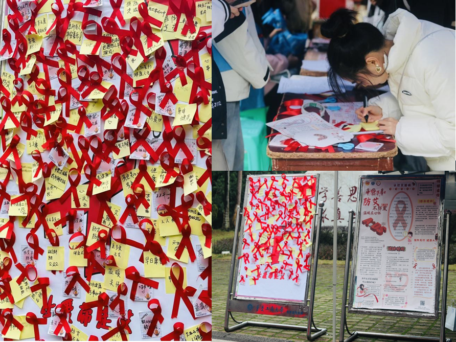 现场活动内容丰富,形式多样,包括抽奖环节、互动小游戏以及转发宣传活动,现场还设置了防艾知识展板、宣传海报和留言板。同学们纷纷驻足观看展板内容,了解防艾知识,并在留言板上留言承诺积极参与防艾行动,以实际行动支持防艾工作,共同营造关爱、支持、不歧视的校园环境。