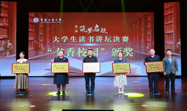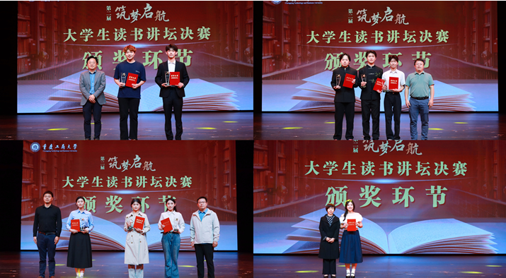 党委学工部、校团委、研工部、发展规划处、管工公司负责人为读书讲坛获奖团队颁发荣誉证书:《你当像鸟飞往你的山》和《全唐诗》获得一等奖;《重庆开埠史》、《红岩》和《我暗恋的桃花源》获得二等奖;《洛夫诗集》、《故乡》和《共产党宣言》获得三等奖;《全唐诗》获得最佳人气奖。