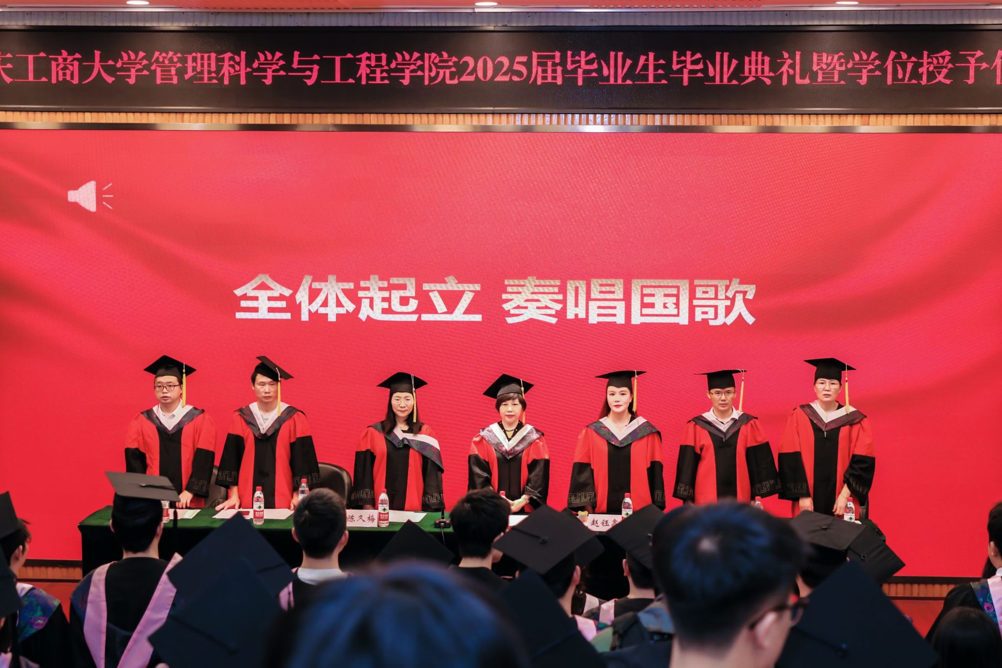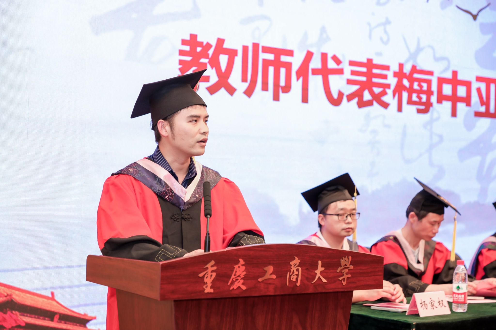 前行不忘引路人。教师代表工程管理系梅中亚老师以“成长、感恩、勇气、初心”四个关键词,深情回顾了同学们从建模少年成长为智慧时代“系统优化者”的历程,鼓励毕业生们以感恩之心面对未来,以勇气迎接挑战,坚守初心,砥砺前行。