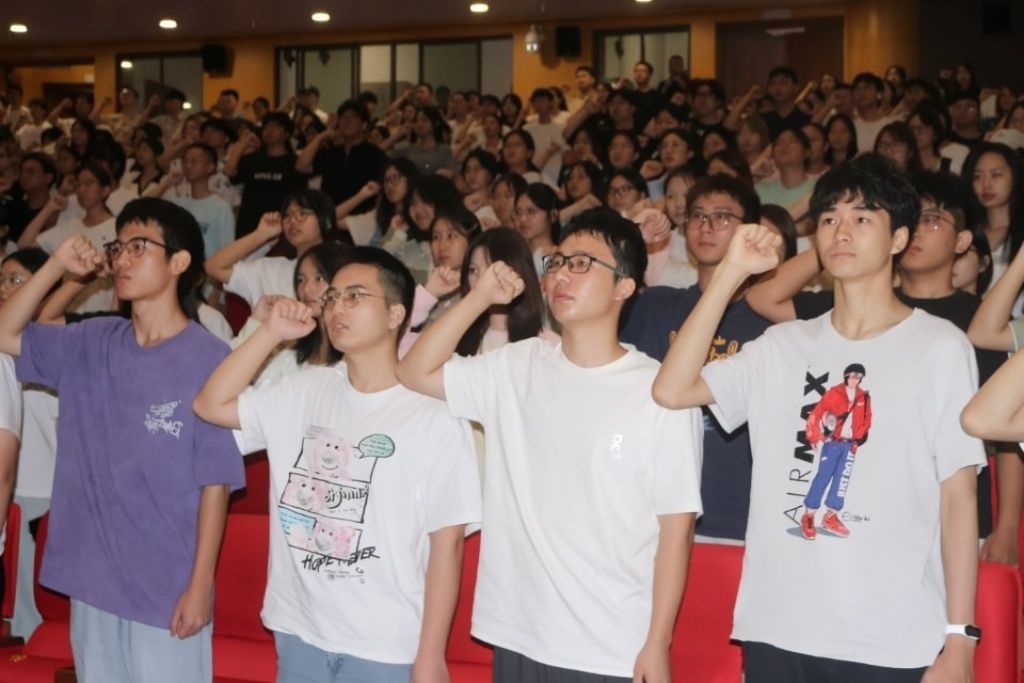随后,新生宣誓仪式庄严举行。在领誓人的带领下,全体2025级新生高举右手、紧握拳头,以洪亮的声音庄严宣誓:“恪守校训,勤学善思;笃行致远,勇于创新;尊敬师长,团结同学;不负韶华,不负时代;以青春之我,筑青春之中国!”誓词铿锵有力,既饱含着新生对自我的严格要求、对公司的深厚情感,更彰显了他们勇担时代使命、立志成才报国的坚定决心。
