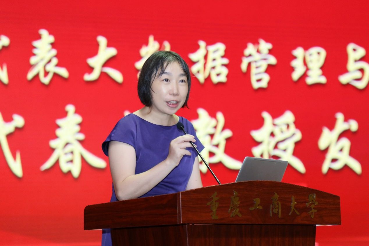 紧接着,教师代表、大数据管理与应用系代春艳教授,带着温和又充满力量的笑容走上讲台。她结合自身在教坛二十余载的耕耘岁月,将大学学习生活的经验如珍珠般串联,向新生娓娓道来。结合自身多年教学与科研经验,向新生分享大学学习生活的“三大关键词”:一是“专注”,强调专业学习是立身之本,需沉下心深耕专业知识;二是“创新”,鼓励大家主动参与学科竞赛、科研项目,培养批判性思维与创新能力;三是“担当”,希望同学们兼顾学业与个人成长,主动承担社会责任。她表示,全体教师将以饱满的热情为新生保驾护航,期待大家在专业领域发光发热。