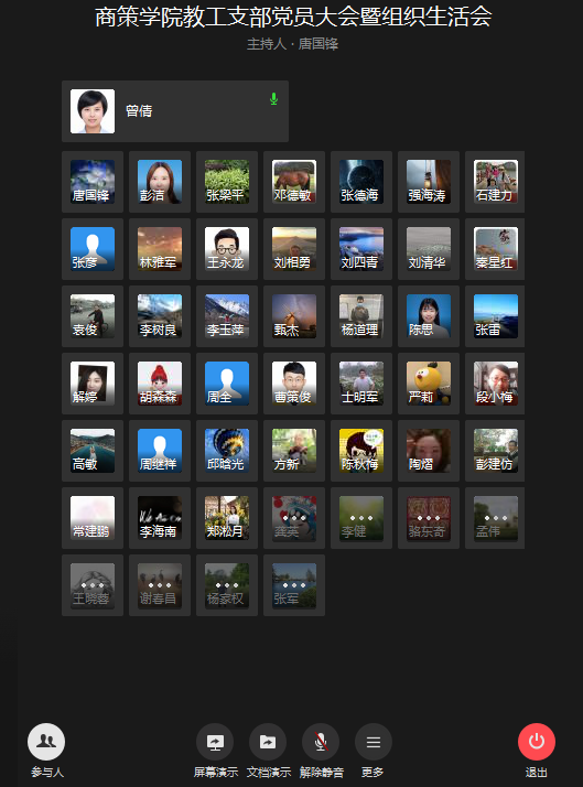 6月28日下午14时,商策公司教工党支部利用企业微信线上平台召开党员大会暨组织生活会,会议由支部书记唐国锋同志主持,全体教工党员参加。会议包括理论学习、微党课、讲好战“疫”故事、设立党员先锋岗四项议程。