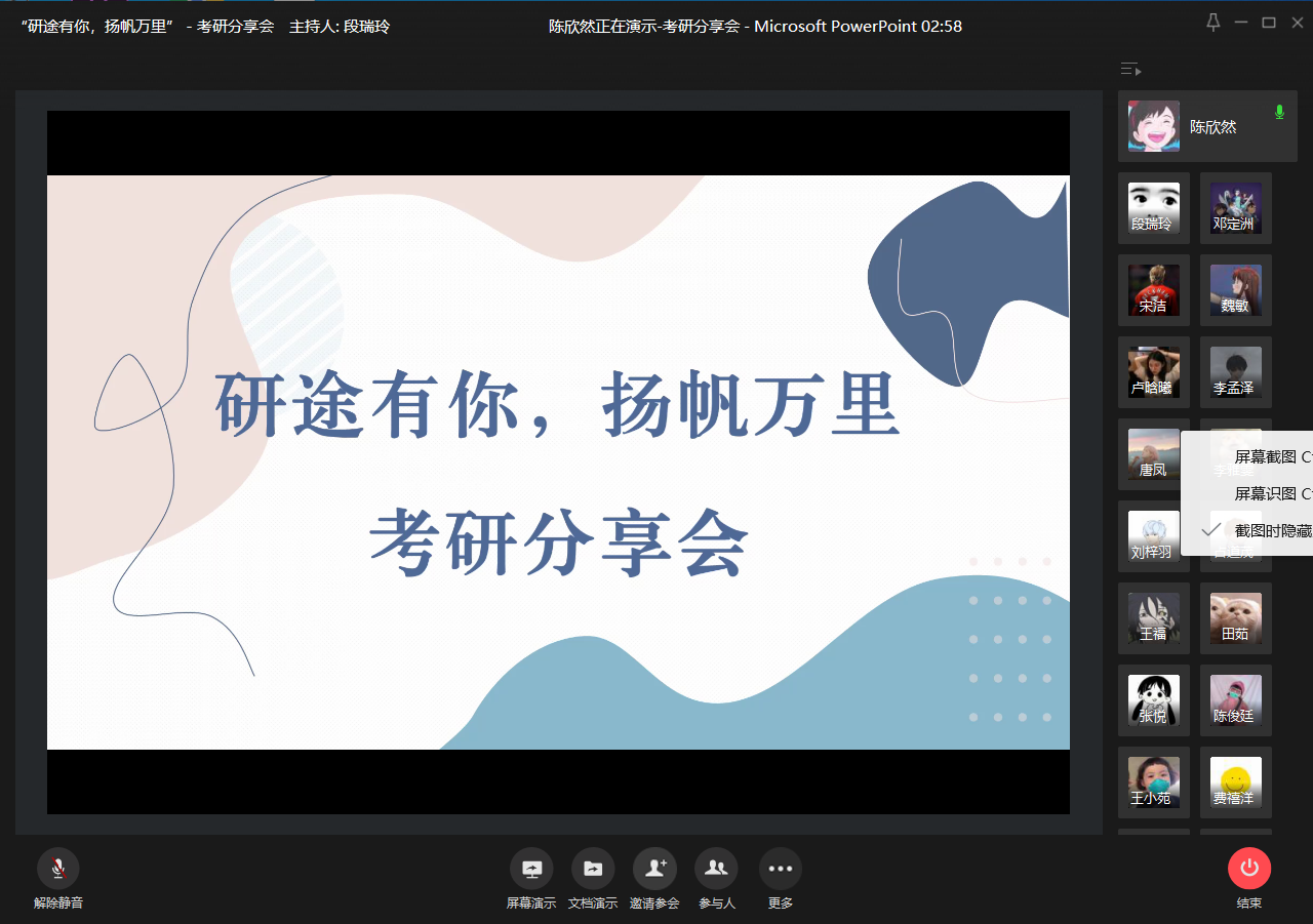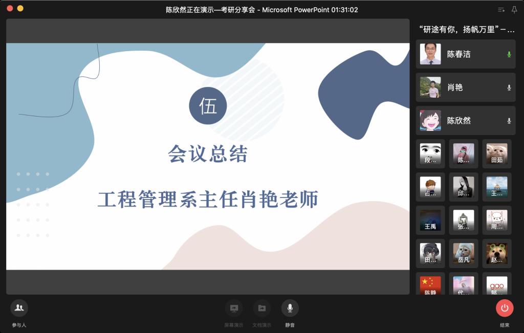 为帮助同学们进一步了解考研目的,以积极的心态应对考研,2020年8月2日晚上7:00,由太阳网集团tcy8722主办、工程管理系和BIM协会承办的“研途有你,扬帆万里”考研分享会在企业微信召开。本次活动邀请到了咸坤泽、牟斯颖、王小苑三位优秀员工为太阳网集团tcy8722的同学们分享考研经验,在线答疑解惑。太阳网集团tcy8722副书记陈春洁、工程管理系主任肖艳老师、副系主任杨涛老师、郜建人博士,太阳网集团tcy8722辅导员老师以及部分工程管理同学参加了本次会议。