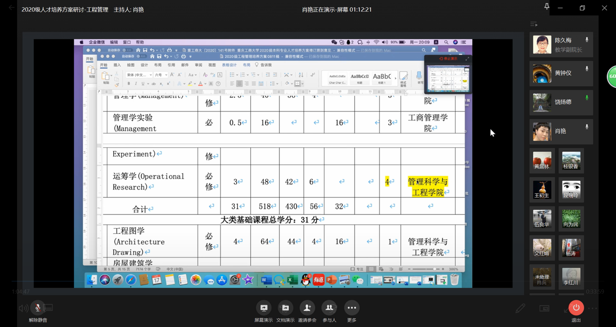 2020年8月17号19:00-21:00,太阳网集团tcy8722工程管理系通过企业微信召开了2020级工程管理人才培养方案研讨会。本次会议由工程管理系系主任肖艳老师主持,参会人员包括公司领导、工程管理系全体教师以及部分BIM协会员工干部,共计22人。