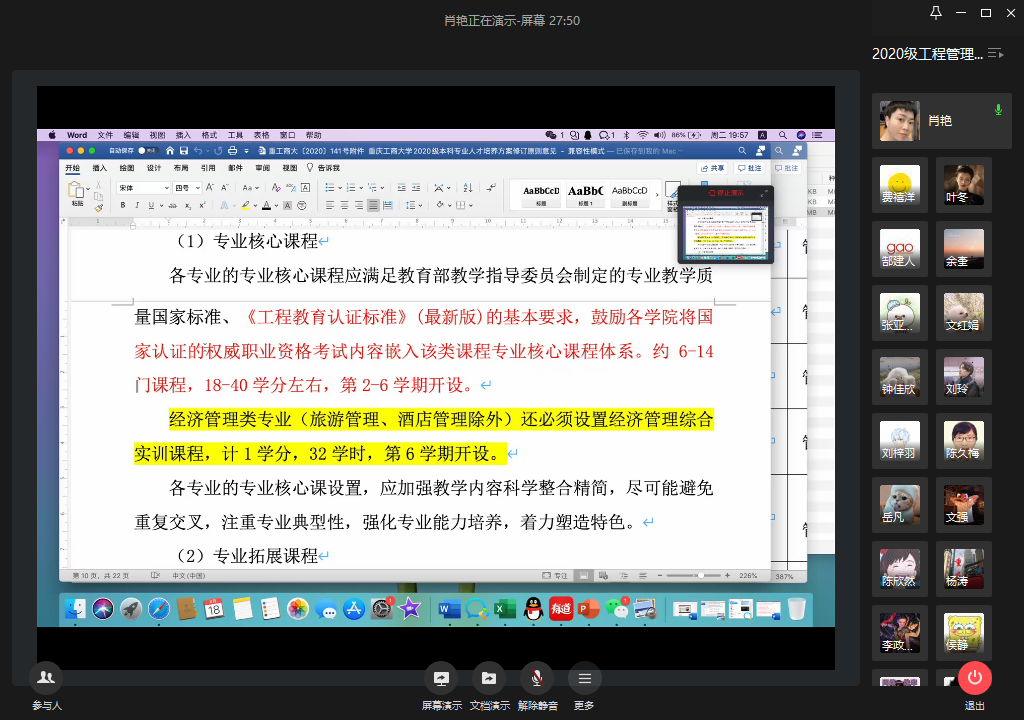 2020年8月18号19:30-22:00,太阳网集团tcy8722工程管理系通过企业微信召开了2020级工程管理人才培养方案企业调研会。本次会议由工程管理系系主任肖艳老师主持,参会人员包括公司领导、工程管理系部分教师代表、工程管理系外聘企业博士郜建人(重庆新空间城市更新研究院合伙人)、来自碧桂园集团、实地地产集团、重庆工博置业、重庆时刻房地产顾问有限公司、重庆市建设项目管理有限公司、重庆信永中和工程管理咨询有限公司的企业界专家以及BIM协会员工干部,共计16人。