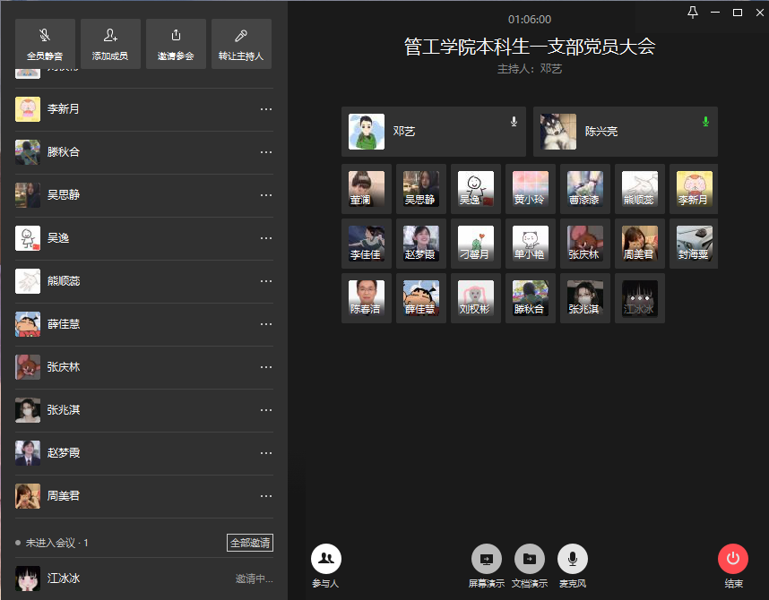 在会议线上交流中,公司分党委陈春洁副书记同支部党员员工深入交流,并嘱咐党员学子:全院本科生1255人,员工党员不足40人。各位都是公司员工中最优秀的分子。请大家时刻牢记身份角色,在学习生活各方面良好发挥模范带头作用,因为你什么样,你身边人就认为共产党什么样!