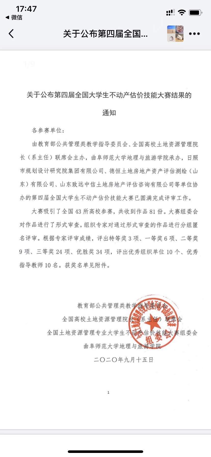 全国老员工不动产估价技能大赛是由教育部公共管理类教学指导委员会、全国高校土地资源管理经理(系主任)联席会主办的、以“新土地管理法背景下的不动产估价实践与创新”为主题,以培养和提升老员工的估价实践技能与实践创新能力为目标,着重考察老员工在不动产估价实务中深入调研待估对象、全面剖析价格影响因素、严谨设计估价思路、合理选择估价方法、规范撰写估价报告的能力及技能。大赛共吸引了全国43所高校参赛,共收到作品81份。根据专家评审成绩,评出特等奖3项,一等奖6项,二等奖9项,三等奖24项,优胜奖34项。