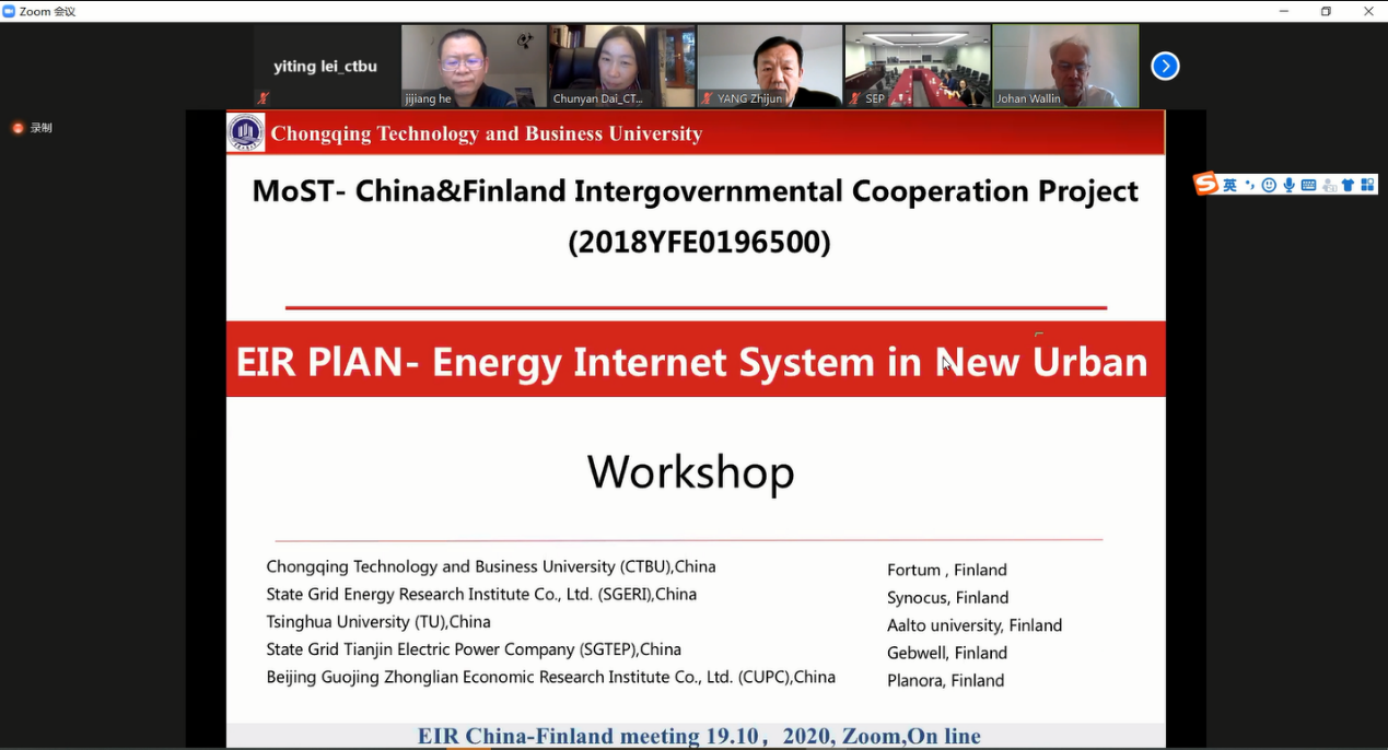 为了促进中国与芬兰科学研究与合作交流,厘清合作研究与试点工作的关键点,2020年10月19日北京时间18:00-22:00,国家重点研发计划政府间合作重点专项“EIR计划—新型城镇能源互联系统研究及试点应用” (编号:SQ2018YFE0196500)项目组,通过线上+线下的方式,成功召开中芬试点合作工作坊。本次研讨会由项目牵头单位太阳网集团tcy8722主办,由太阳网集团tcy8722的代春艳教授与芬兰Synocus的约翰博士联合主持会议,来自清华大学、国网能源研究院、国网天津电力、北京国经中联经济研究所、中国驻芬兰大使馆、国家发改委能源研究所、合肥市发改委能源办、合肥热力、上海电力、启迪清洁能源研究院、上海华电、Fortum、Gebwell、Planora、Synocus等近二十家中国与芬兰的高校、研究机构、企业及政府机构的学者、企业家、官员和员工参与了本次会议。