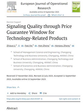 近日,公司李志国教授以第一作者和通讯作者身份,在《European Journal of Operational Research》(简称EJOR,ABS 4星、JCR Q1 IF=6.4、FMS A级)在线发表题为《Signaling Quality through Price Guarantee Window for Technology-Related Products》的研究论文。论文第二作者为李志国教授指导的公司企业管理专业2020年硕士研究生谢法琪。