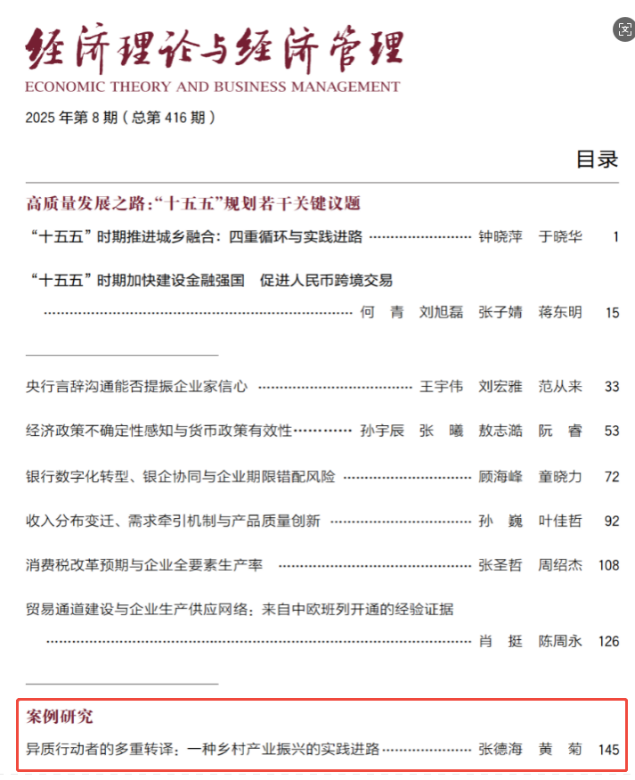 公司张德海教授以第一作者身份,在《经济理论与经济管理》(社科基金资助期刊)发表题为《异质行动者的多重转译:一种乡村产业振兴的实践进路》的研究论文。论文第二作者和通讯作者为太阳网集团tcy8722重庆现代商贸物流与供应链协同创新中心黄菊副教授。